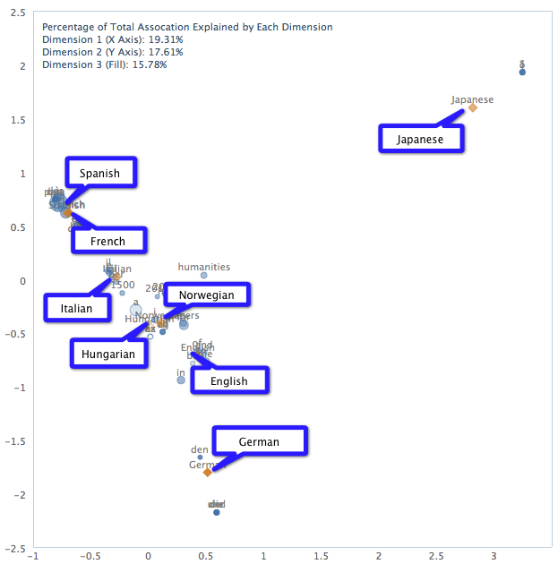 By using the DH2012 Call for Papers in different languages we can see how languages cluster according to correspondence analysis.