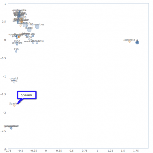 Because of the bunching of values, the default view can be difficult to read. It is possible to zoom in on part of the visualization to see what’s happening, and to hover over data points to read the labels. Here is a clearer (static image) that labels languages: