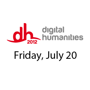 It is the last day of DH2012 and we will soon be starting to wipe our tears and saying goodbye. But let’s focus on today’s programme: we have a few cancellations for Friday. T. Declerck’s presentation in LP 23 and the short paper presentations of C. Tatum and S. Wiesner in SP 08 are cancelled. We will close this conference in the afternoon with the keynote speech of Masahiro Shimoda from 16:00 – 17:00 followed by a few final words of thanks and DH perspectives. Don’t forget to pick up your poster from the West Wing Foyer in case you want to take it with you!