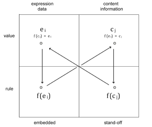 Both the expression and the content (Hjelmslev 1961) of the text are open to variation.  Dealing with textual variants is the task of textual criticism, just as dealing with interpretative variants is that of the literary critic. But we are not at loss in tackling these problems with computational means. We can exploit the ambivalent status of markup to represent the dynamics of variation. (Buzzetti 2009) As a diacritical mark, the markup can be construed either as belonging to the text or as providing an external description of its structure. We may therefore attribute to the markup both a descriptive and a performative function. (Renear 2000) Assumed in its performative capacity, the markup can be seen as an instruction, or as a rule, to determine the semantic structure of the text, whereas taken declaratively it can be equated to a variant of the string of characters that constitutes the text. Referring to a stand-off metadata representation of the textual information content, or to a stand-off markup of sorts with semantic import, we can all the same assume their structural marks in both acceptations, declarative and performative, and get an overall dynamic model of textual and interpretative variation, as shown in Figure 1: