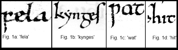 Although these questions may look similar, they have a range of important differences which are largely concealed by the ambiguous word ‘letter’. The challenge is therefore how to model handwriting in sufficient detail to represent these nuances, considering not only a scribe’s general practice but also its specific instances. It requires first a clear distinction between script (‘the model which the scribe has in mind’s eye when he writes’), and (scribal) hand (‘what he actually puts down on the page’: Parkes 1969: xxvi). The word ‘letter’ is also ambiguous, and so further terms are useful here. Starting with the most concrete, a graph is an instance of the letter as written on the page. In contrast, an idiograph is ‘the way (or one of the ways) in which a given writer habitually writes’ a given letter, and an allograph is a recognised way of writing the given letter, as shared by a group rather than being distinctive of any given individual (Davis 2007: 254-255; cf. also Emiliano 2011).7 A grapheme is a letter-entity as an idealized, abstract, discrete, unit of a writing system. Also useful is Unicode’s character to refer to the intermediate level between grapheme (which by definition has no physical form) and allograph. Thus the grapheme <a> has (at least) two characters, ‘capital’ A and ‘small’ a. The second of these has many allographs, one of which is Insular a, this is normally found in the script known as Insular cursive minuscule; in Figure 1a and 1c we have two distinct allographs of a; and so on. Grapheme and character are both ‘emic’, whereas allograph, idiograph and graph are all ‘etic’.