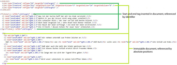 Due to scholars usually having different access privileges to various documents they want to work with, TTLE will offer three ways to select text fragments, depending on the accessibility of the source document. If the source document is writable for the user, corresponding tags to mark start and end of a selection will be inserted into the document. If a document is immutable for all users, a document-offset for start and end of the selection will be calculated, this also allows the selection of any text fragment.