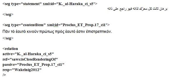 This is equivalent to stating that the Arabic segment identified as ‘K._al-Haraka_ci_s5’ is a close rendering of the Greek segment identified as ‘Proclus_ET_Prop.17_ci1’, and that this relationship has been asserted by Elvira Wakelnig, 2012.