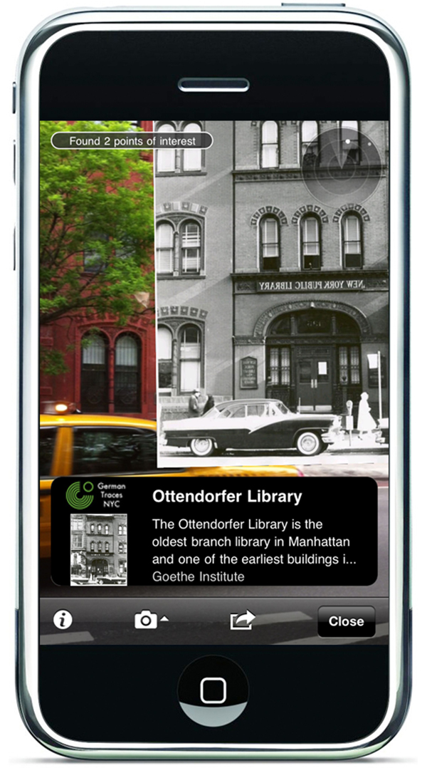 GeoStoryteller builds upon recent research and development from the emerging subfield of the Digital Humanities known as GeoHumanities, which is a term that highlights the growing interconnections between geography and the humanities. GeoStoryteller strengthens this connection specifically by layering historic narratives on a specific location and by making it available to learners’ Internet-enabled mobile device. In the case of the application of GeoStoryteller with the Goethe-Institut – named German Traces NYC – learners can view location-sensitive maps and lists of historic sites related to German immigration to New York. Once a learner arrives at a physical site, he or she can see historic photos layered against the imagery visible through the camera’s phone (also known as augmented reality), as well as watch videos about that particular site that include historic narratives and archival photos. Users can also play short trivia games that answers can only be found from being on physical location and post their accomplishments to Facebook or Twitter.